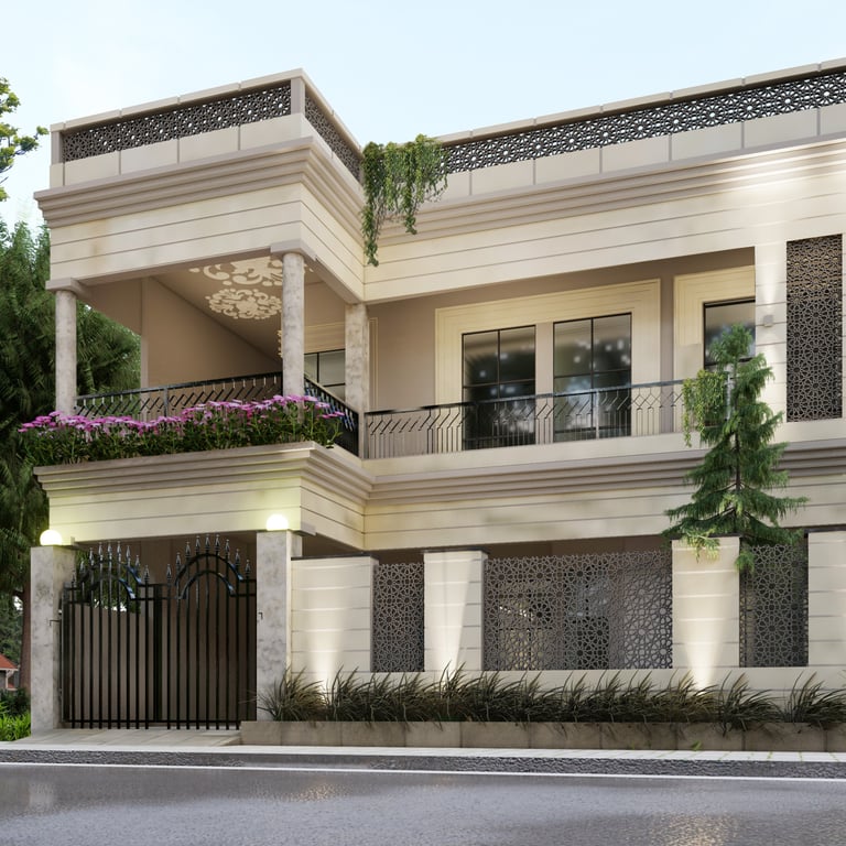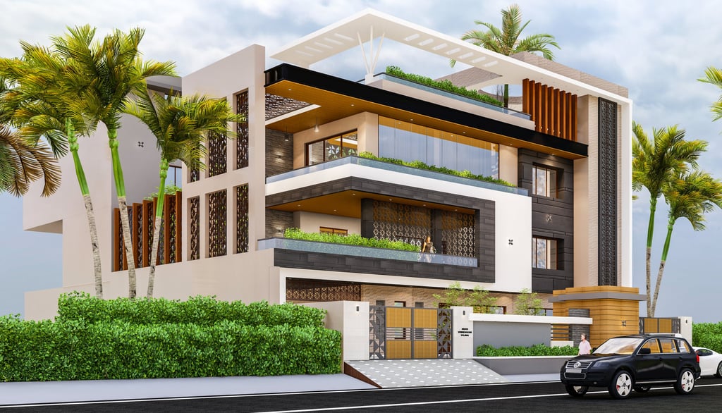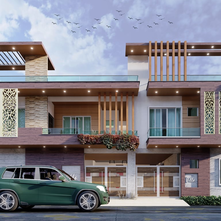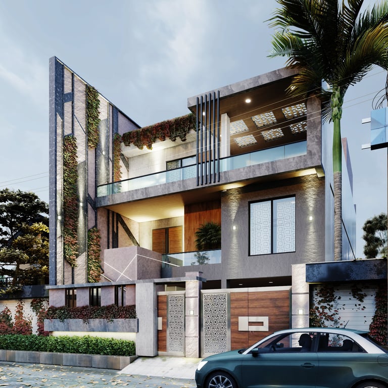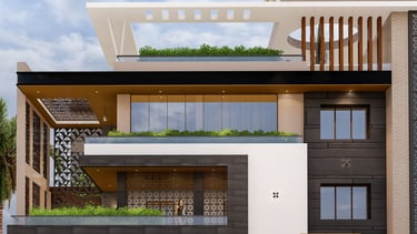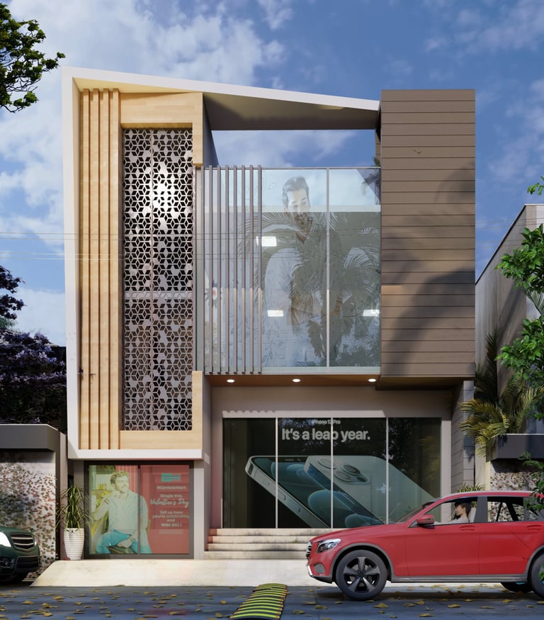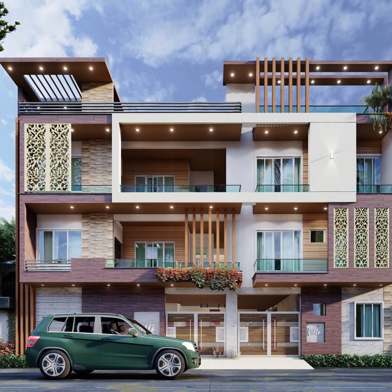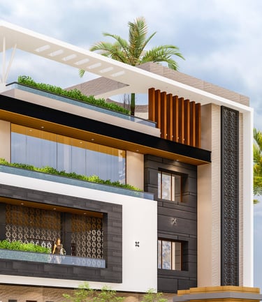 A modern façade with clean geometry, enriched with natural materials and jaali elements for privacy.