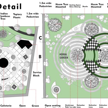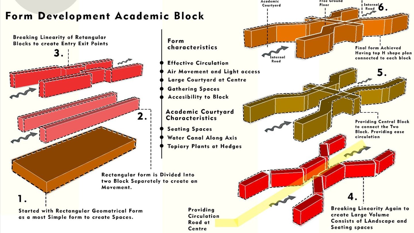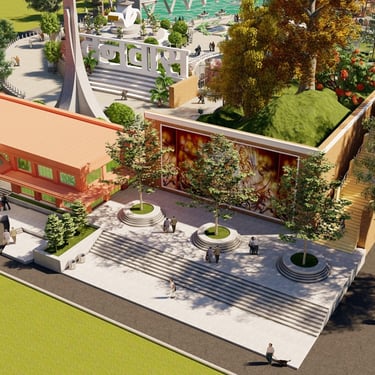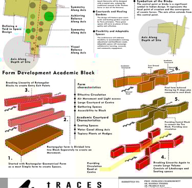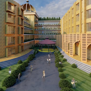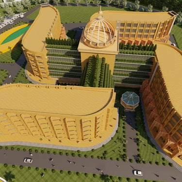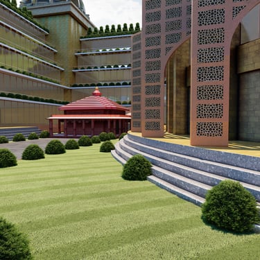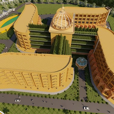 This architectural project is situated within the historic and culturally rich context of Lucknow, the capital city of Uttar Pradesh, India. The site encompasses the existing Government Press at Aishbagh, a location with a strong historical track record and impressive architectural heritage. The design proposal for this area draws profound inspiration from Lucknow's unique blend of Mughal, Awadhi, and British colonial architectural styles, integrating these influences with modern sustainable practices. The development is organized into distinct blocks—Rig, Yajur, Atharva, and Sam—allocated for workshops, offices, laboratories, and auditoriums, creating a complex that harmonizes its significant historical setting with contemporary functionality and symbolic design elements rooted in local tradition.