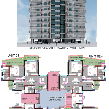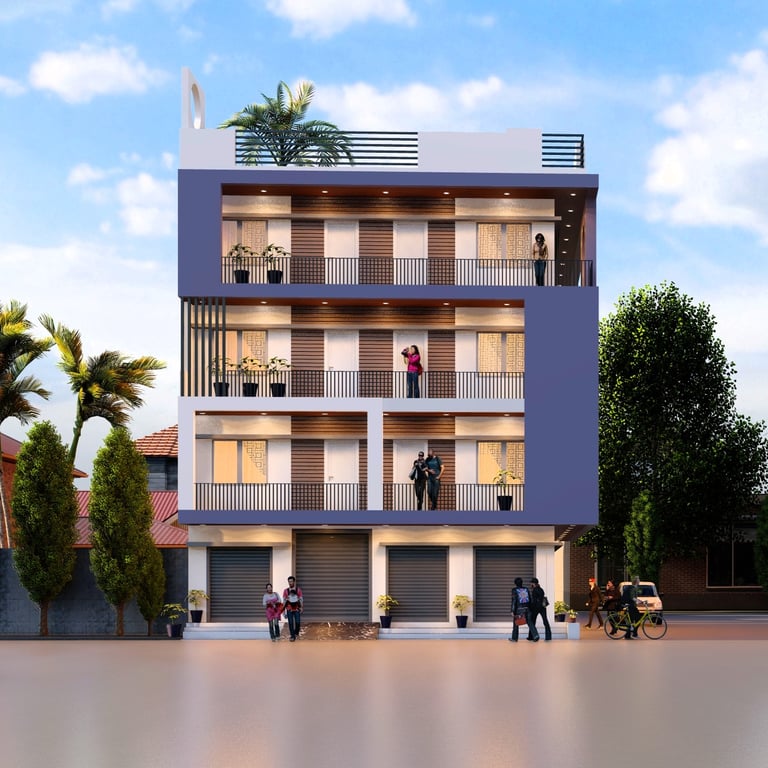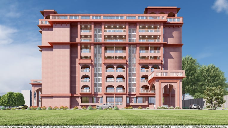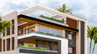 The design approach revolves around the idea of blending indoor and outdoor living. Large balconies and landscaped terraces are integrated at each level, ensuring greenery and natural light flow into the interiors. The façade is crafted with a fusion of modern geometry, wooden textures, jaali screens, and sleek glazing, creating a dynamic play of light, shade, and transparency.