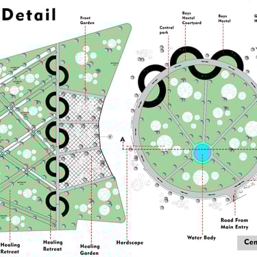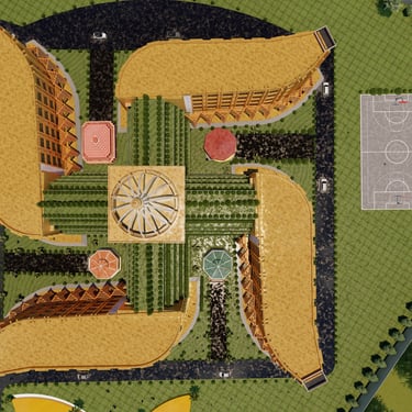 Formal Generator: The spatial layout and arrangement of the building blocks (Rig, Yajur, Atharva, Sam) are directly inspired by the geometry of the Swastika. The arms of the symbol likely dictate the circulation paths, the placement of buildings, and the creation of the central and peripheral courtyards.